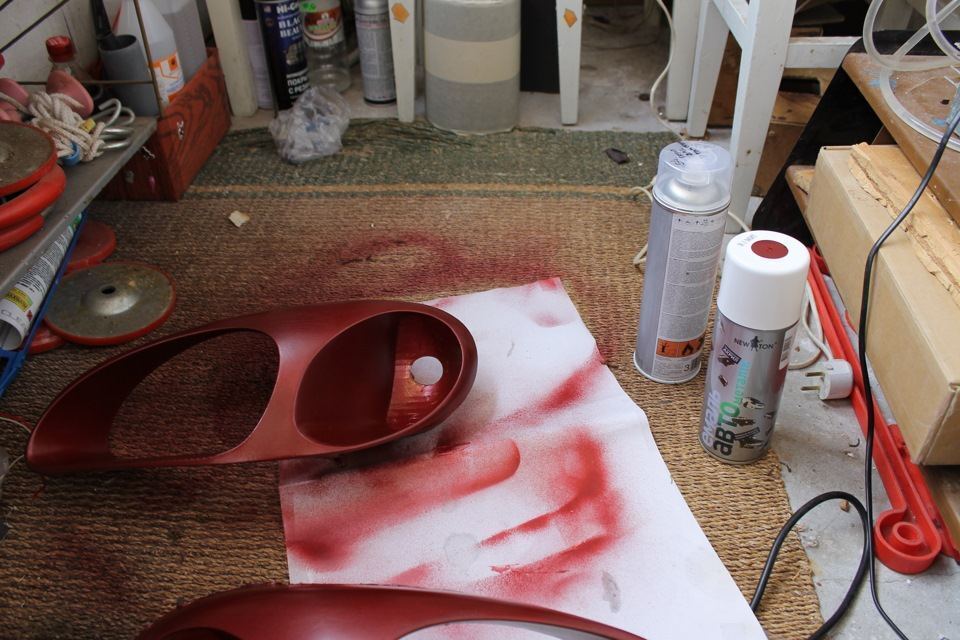 Вот и меня настигла эта участь. Дань моде так сказать. Решил покрасить маски фар. Но хотелось ни как у всех черным, а в цвет кузова. Купил краску, т.к. не нашел на кузове кода краски, то поверил сервисной книге — огненно красный. Но немного с цветом не угадал. С начала вроде светлее было, но потом ещё один слой краски и вот что вышло.