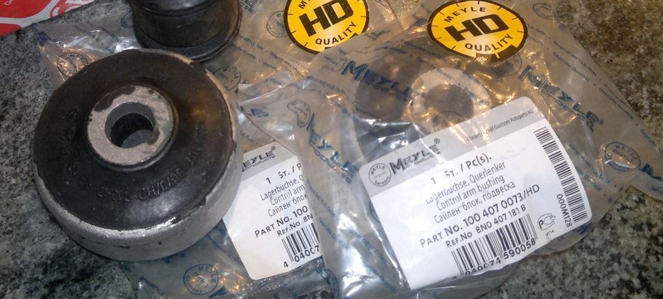 Еще в начале 2012 года перешел с родных задних сайлентблоков передних рычагов (с прорезями) на цельнорезиновые (как в ТТ). Первый опыт был не удачный — взял самые дешевые Optimal, но они буквально за пол года порвались. Заменил их уже более дорогими, но проходили чуть больше 7-8 месяцев.