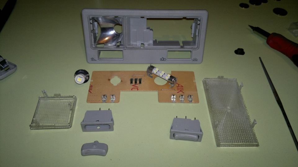 Были зачищены контакты в задних плафонах и на выключателях центрального плафона, теперь должно светить без "мерцаний" из-за плохого контакта.