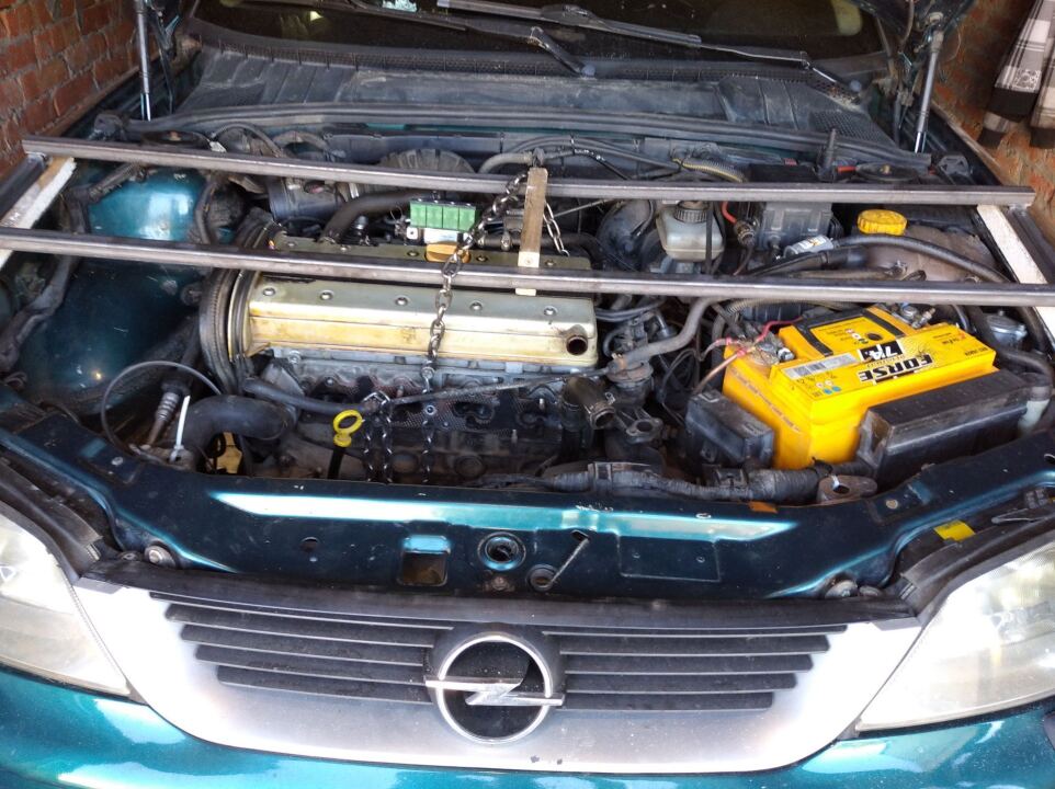 Снял компрессор кондиционера для ремонта. Решил сразу и коробку махнуть. Чтобы снять кпп нужно снять подрамник. Для этого двигатель нужно зафиксировать.